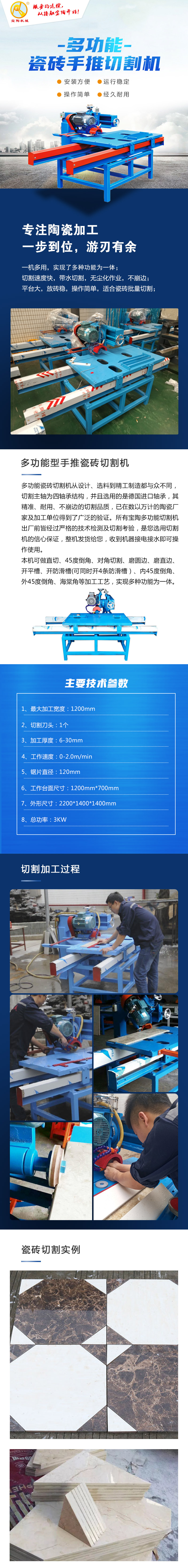 1200型多功能瓷磚切割機(jī)整機(jī)國標(biāo)鋼材打造,剛性更好,更耐用,工業(yè)級別的3KW電機(jī),動力更加強(qiáng)勁,采用品牌原裝電機(jī)(全銅線),使用壽命更長,超大的切割能力。最大能切1200mm長的瓷磚,可做直切、45度倒角、對角切割、磨圓邊、磨直邊、開平槽、開防滑槽(可同時開4條防滑槽)、內(nèi)45度倒角、外45度倒角、海棠角等加工工藝,實(shí)現(xiàn)了多種功能為一體??梢约庸翘萏げ健⑻菁壌u、地腳線等。