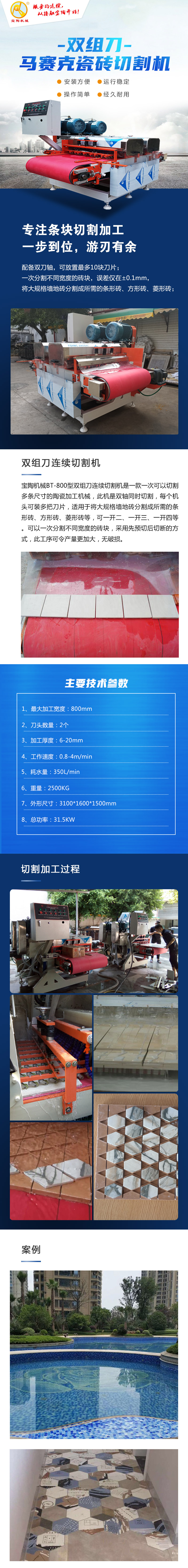 BT-800型雙組刀自動切割機(jī)適用于用拋光磚分割成各種規(guī)格的高檔馬賽克,尺寸最小可分割10mm×10mm及各種形狀,如菱形、六角型等,分割中可同時進(jìn)行倒面角,完全不需要人手再加工,本機(jī)具有機(jī)械性能穩(wěn)定,在分割小形馬賽克時,可壓穩(wěn)磚塊,確保分割開的小形磚塊不會飛出及效率高,質(zhì)量好等特點。