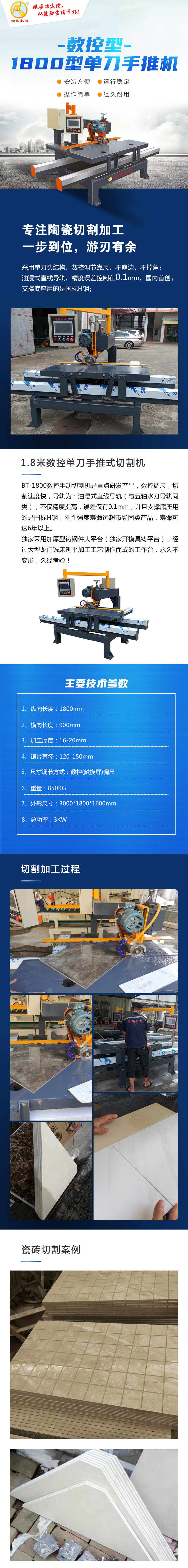 BT-1800型單刀數(shù)控手動瓷磚切割機(jī)是數(shù)控型瓷磚切割機(jī),帶有數(shù)控操作系統(tǒng),解決了切割尺寸多樣,復(fù)雜多變,加工麻煩的難題,采用數(shù)字控制調(diào)節(jié)靠尺,加工精度高,切割無大小頭,切割效果好等特點(diǎn),不分生熟手均可操作??梢越o客戶降低人工成本費(fèi)用,節(jié)約了切割時間,機(jī)器穩(wěn)定性超強(qiáng),切割精準(zhǔn)度高,操作系統(tǒng)簡單,任何一個人都可以隨意操作。