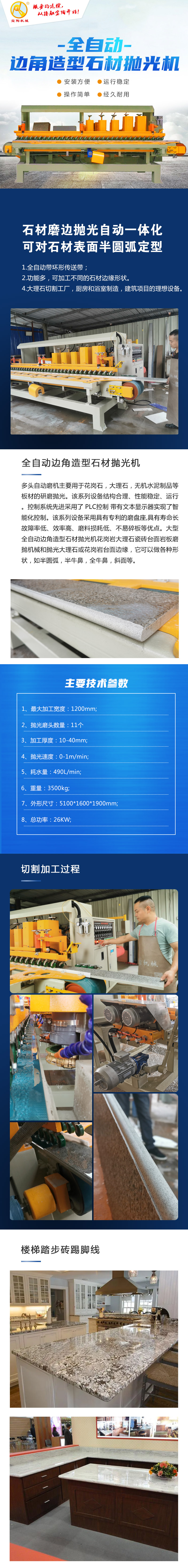 多頭自動磨機主要用于花崗石,大理石,無機水泥制品等板材的研磨拋光。該系列設(shè)備結(jié)構(gòu)合理、性能穩(wěn)定、運行??刂葡到y(tǒng)先進(jìn)采用了 PLC控制 帶有文本顯示器實現(xiàn)了智能化控制。該系列設(shè)備采用具有專利的磨盤座,具有壽命長故障率低、效率高、磨料損耗低、不易碎板等優(yōu)點。大型全自動邊角造型石材拋光機花崗巖大理石瓷磚臺面巖板磨拋機械和拋光大理石或花崗巖臺面邊緣,它可以做各種形狀,如半圓弧,半牛鼻,全牛鼻,斜面等